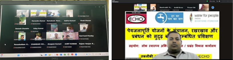 Water For People is strengthening WASH service delivery by using DPI and structured learning platforms such as iECHO. Recent virtual sessions focused on Jal Chaupals, water quality testing using Field Testing Kits and H₂S vials, tank cleaning, and O&M of Rural Piped Water Supply Schemes, reinforcing community-led monitoring under Har Ghar Swachhta and Har Ghar Sujalata. Monthly iECHO sessions in Nalanda brought together frontline workers, PRIs members, and PHED officials to address O&M challenges, grievance redressal, and preventive maintenance.